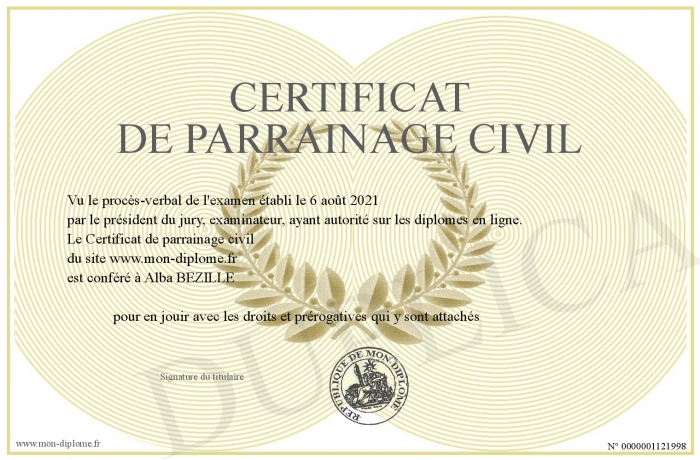 Envoyez par email votre Certificat de parrainage civil personalisé