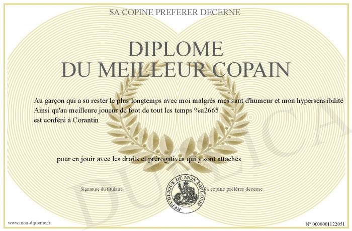 Envoyez par email votre Diplome Du Meilleur Copain personalisé