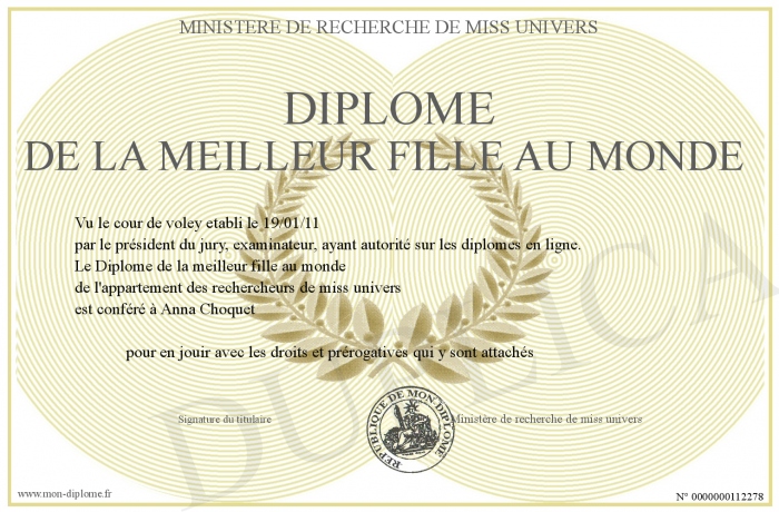 Envoyez par email votre Diplome de la meilleur fille au monde personalisé