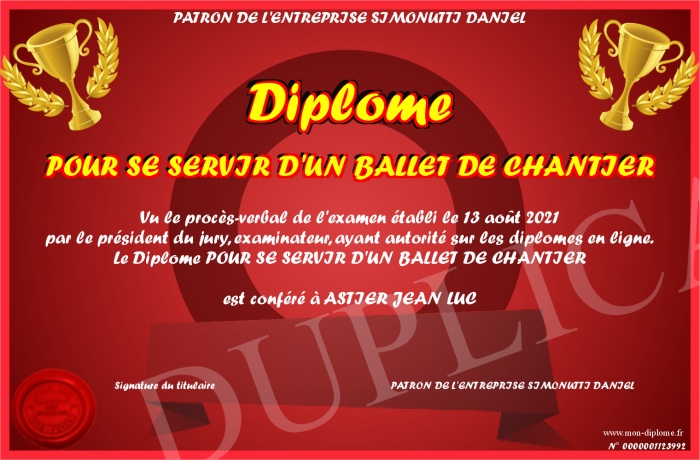 Envoyez par email votre Diplôme POUR SE SERVIR D'UN BALLET DE CHANTIER personalisé