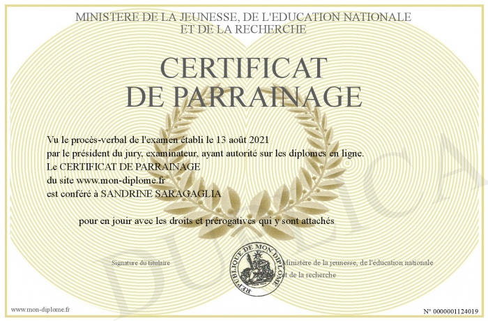 Envoyez par email votre CERTIFICAT DE PARRAINAGE personalisé