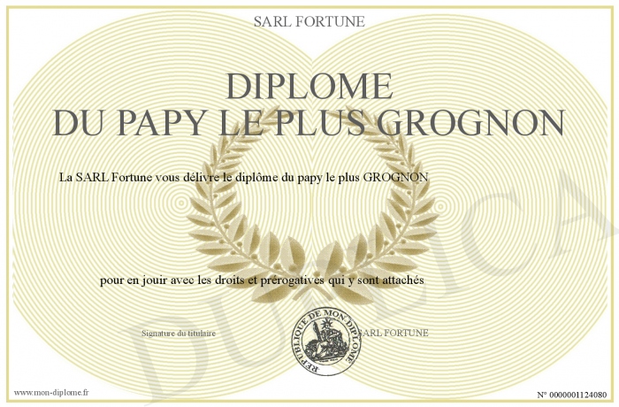 Envoyez par email votre Diplôme du papy le plus GROGNON personalisé