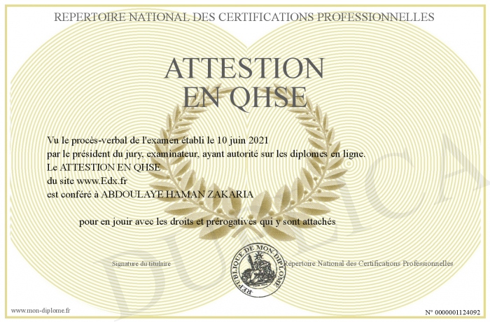 Envoyez par email votre ATTESTION EN QHSE personalisé