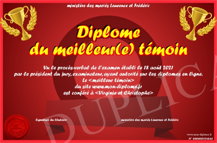 Envoyez par email votre Diplôme du meilleur(e) témoin personalisé