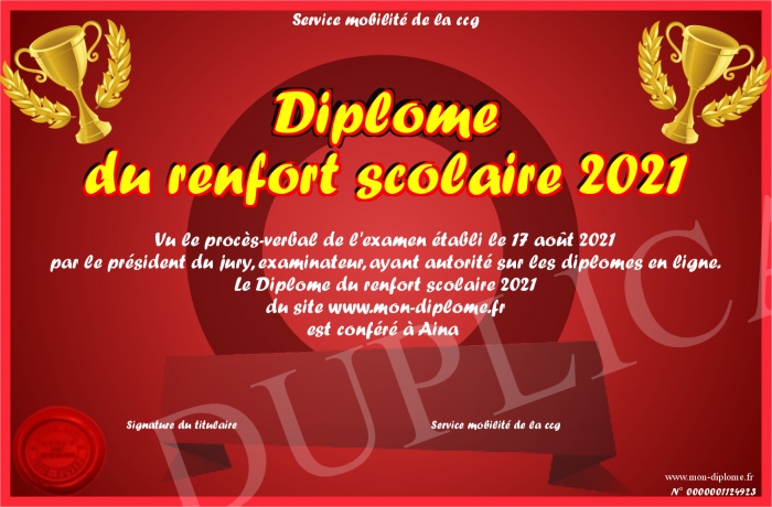 Envoyez par email votre Diplôme du renfort scolaire 2021 personalisé
