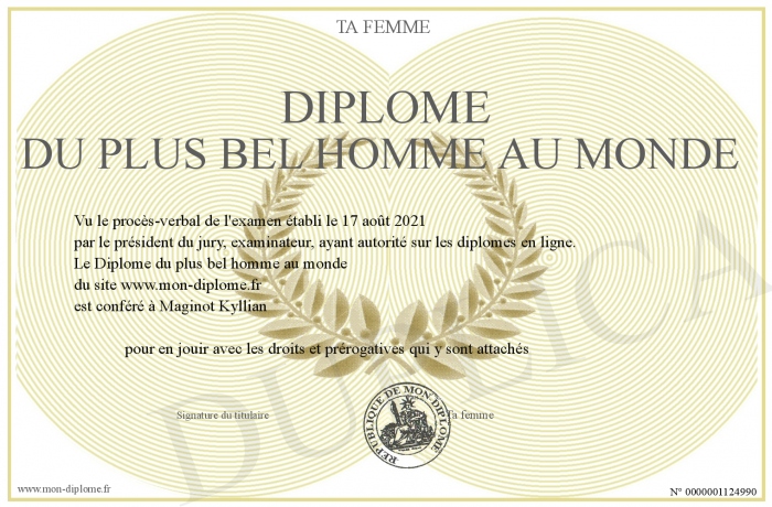 Envoyez par email votre Diplôme du plus bel homme au monde personalisé