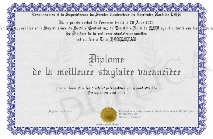 Envoyez par email votre Diplôme de la meilleure stagiaire vacancière personalisé