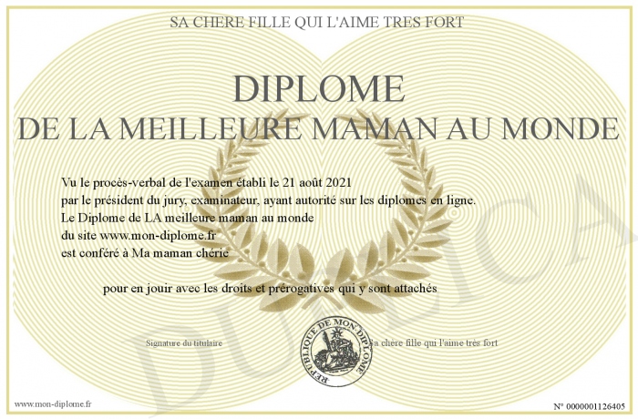 Envoyez par email votre Diplôme de LA meilleure maman au monde personalisé