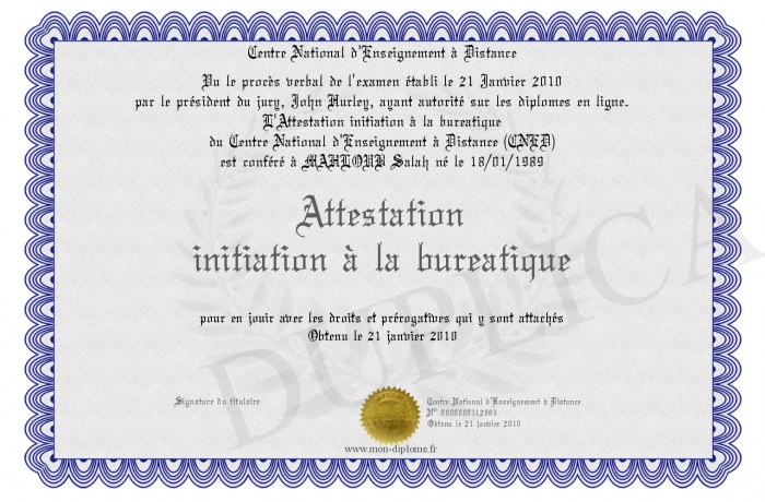 Envoyez par email votre Attestation initiation à la bureatique personalisé