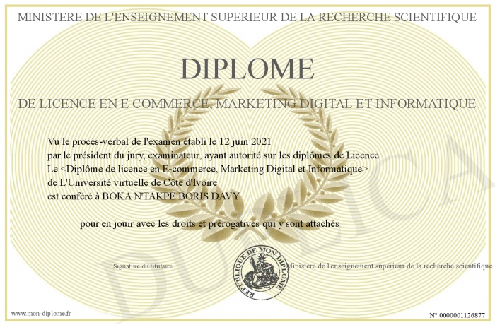 Envoyez par email votre Diplôme de licence en E commerce, Marketing Digital et Informatique personalisé