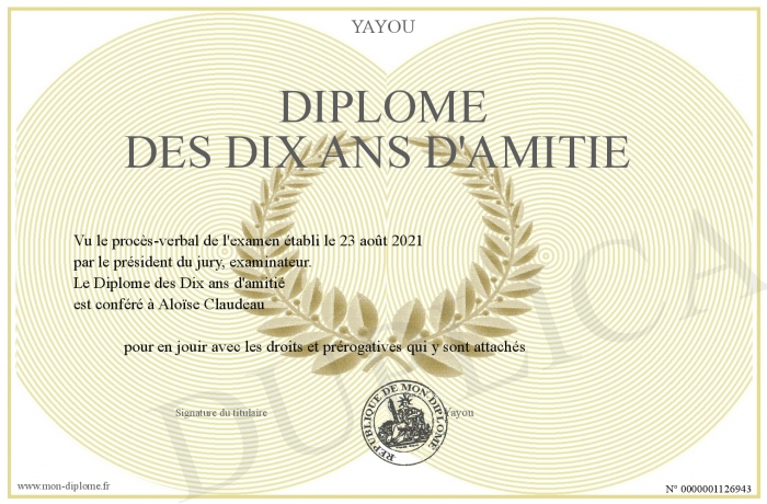 Envoyez par email votre Diplôme des Dix ans d'amitié personalisé