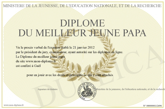 Envoyez par email votre Diplôme du meilleur jeune papa personalisé