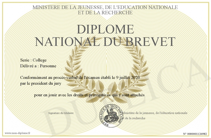 Envoyez par email votre Diplôme National Du Brevet personalisé