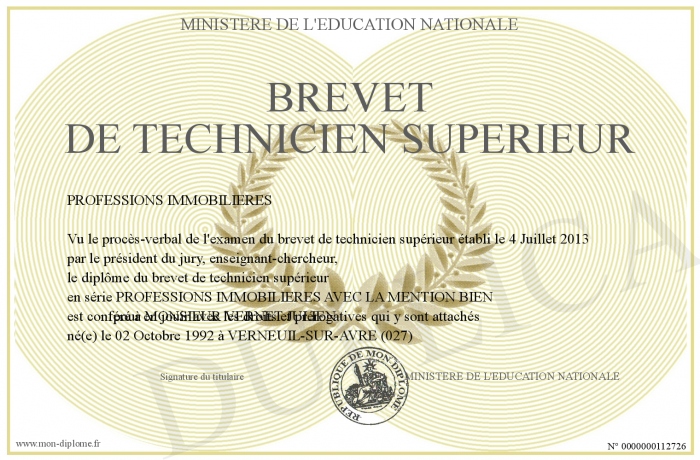 Envoyez par email votre BREVET DE TECHNICIEN SUPERIEUR personalisé