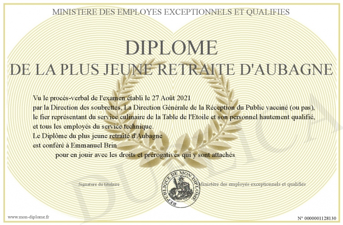 Envoyez par email votre Diplôme de la plus jeune retraite d'Aubagne personalisé