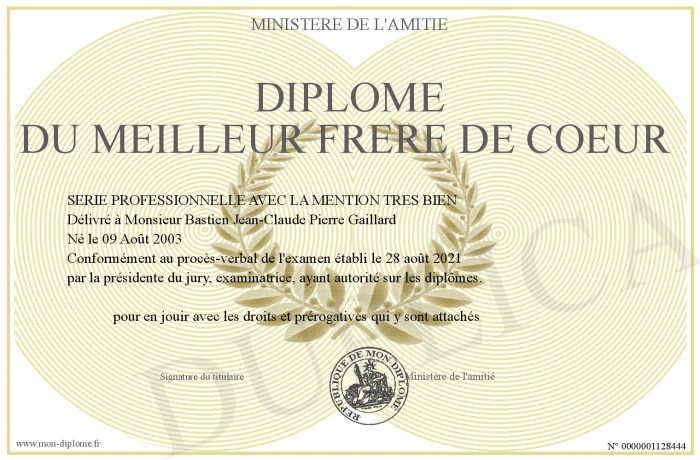 Envoyez par email votre Diplôme du meilleur frère de coeur personalisé