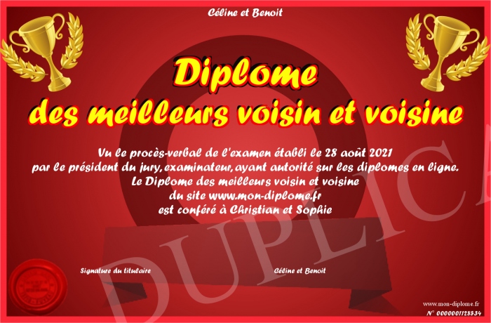 Envoyez par email votre Diplôme des meilleurs voisin et voisine personalisé