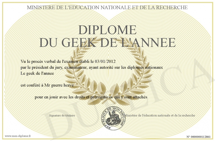 Envoyez par email votre Diplôme du Geek de l'annee personalisé