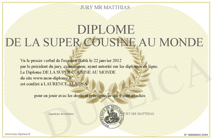 Envoyez par email votre Diplôme DE LA SUPER COUSINE AU MONDE personalisé