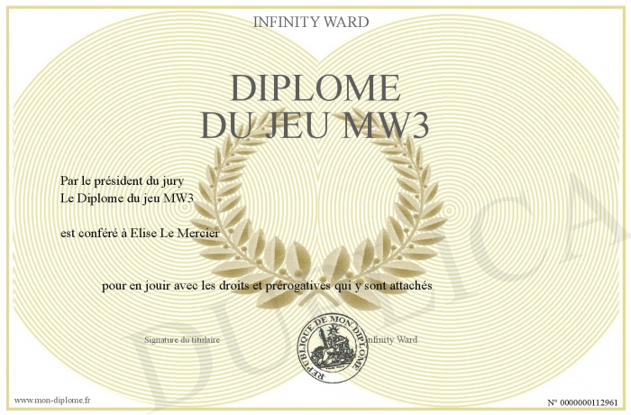 Envoyez par email votre Diplôme du jeu MW3 personalisé