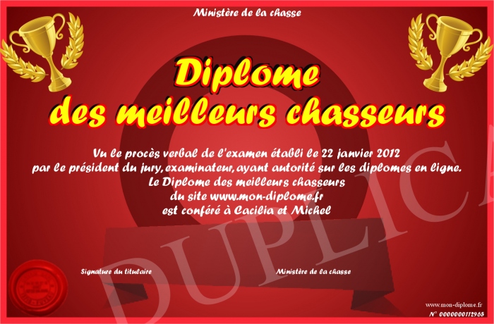 Envoyez par email votre Diplôme des meilleurs chasseurs personalisé