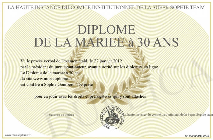 Envoyez par email votre Diplôme de la mariée à 30 ans personalisé