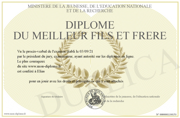 Envoyez par email votre Diplôme du meilleur fils et frere personalisé
