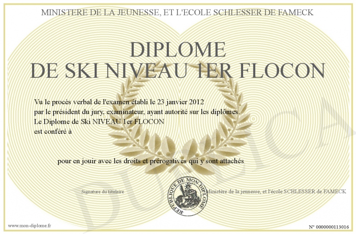 Envoyez par email votre Diplôme de Ski NIVEAU 1er FLOCON personalisé
