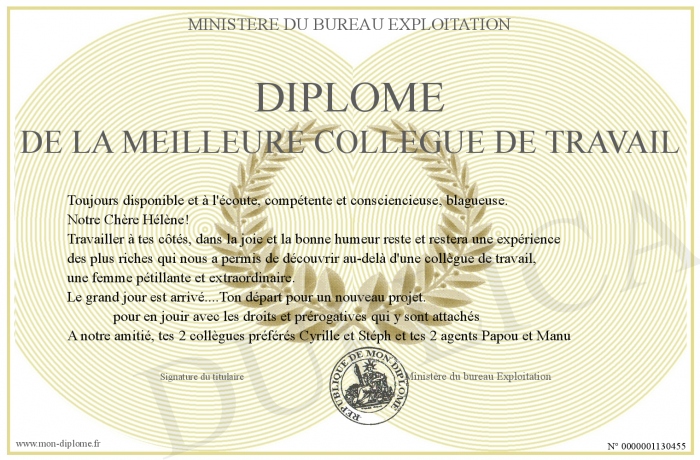 Envoyez par email votre DIPLOME DE LA MEILLEURE COLLEGUE DE TRAVAIL personalisé