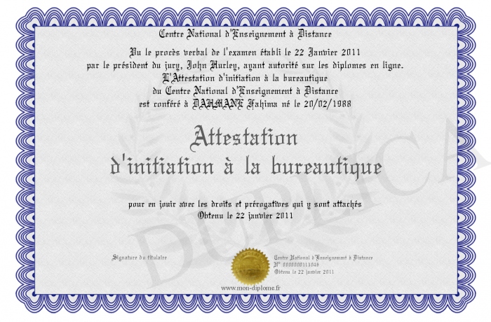 Envoyez par email votre Attestation d'initiation à la bureautique personalisé
