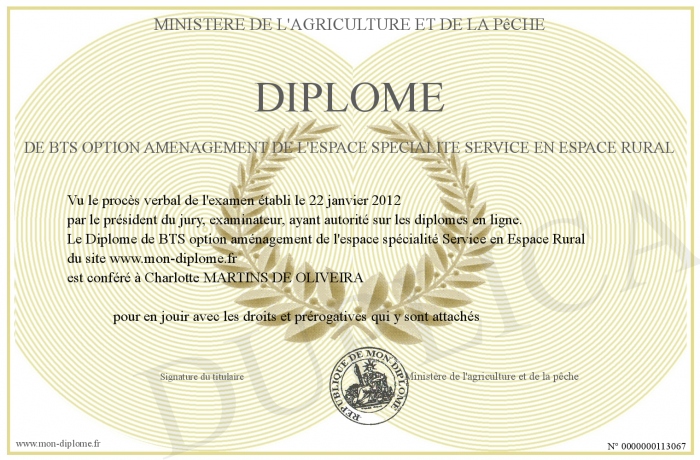Envoyez par email votre Diplome de BTS option aménagement de l'espace spécialité Service en Espace Rural personalisé