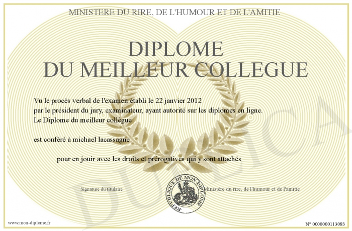 Envoyez par email votre Diplome du meilleur collègue personalisé