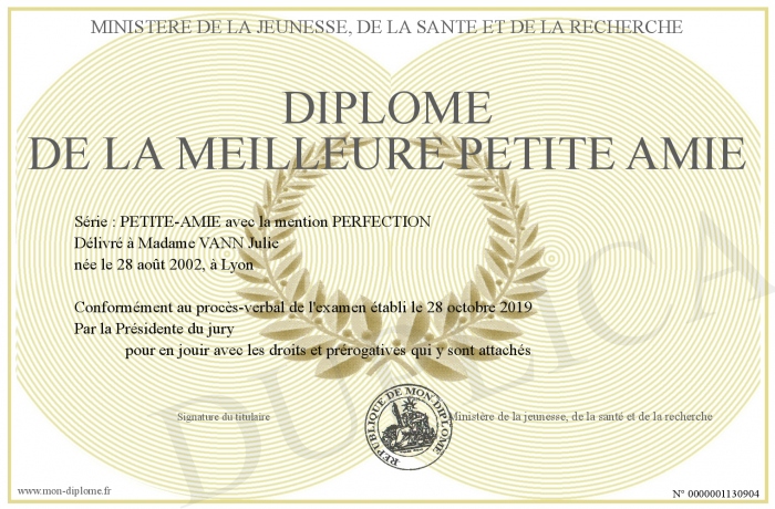 Envoyez par email votre Diplôme de La meilleure petite amie personalisé