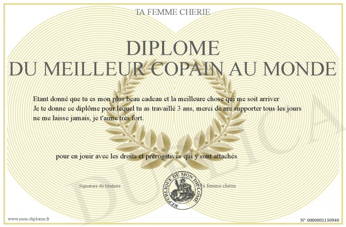 Envoyez par email votre Diplome du meilleur copain au monde personalisé