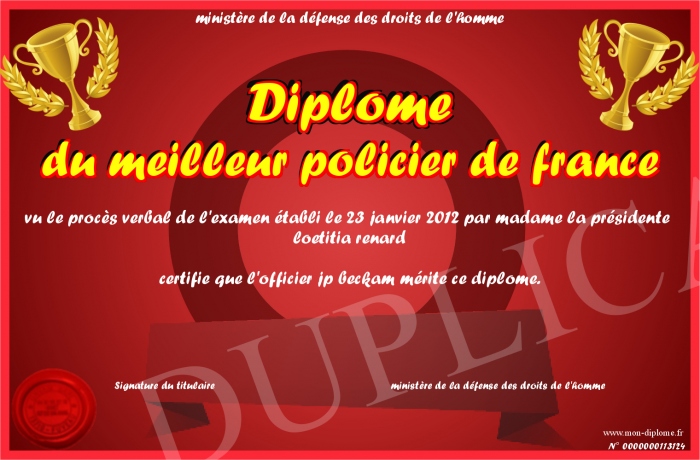 Envoyez par email votre Diplôme du meilleur policier de france personalisé