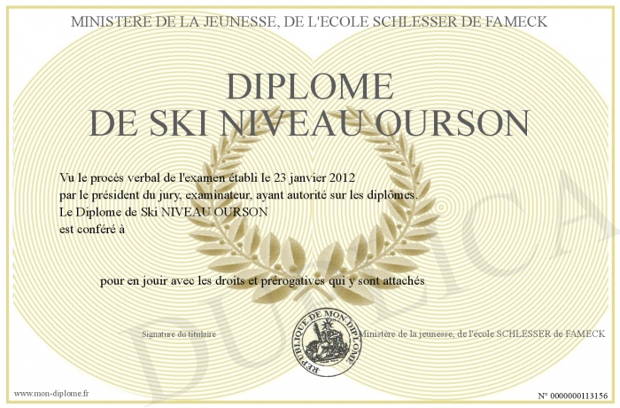 Envoyez par email votre Diplôme de Ski NIVEAU OURSON personalisé