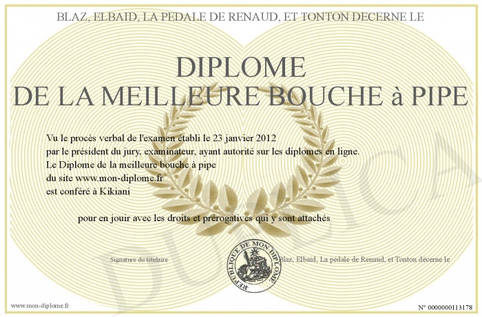 Envoyez par email votre Diplome de la meilleure bouche à pipe personalisé