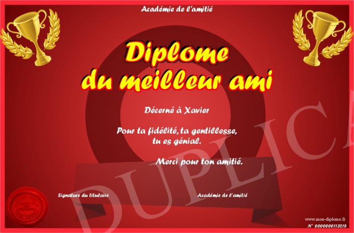 Envoyez par email votre Diplôme du meilleur ami personalisé