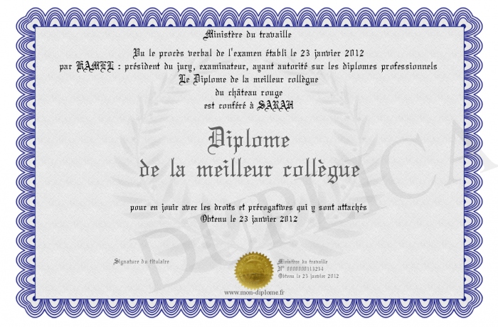 Envoyez par email votre Diplome de la meilleur collègue personalisé