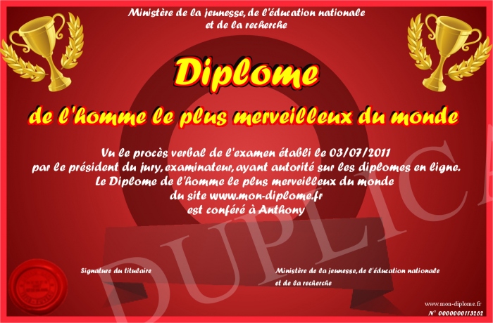 Envoyez par email votre Diplôme de l'homme le plus merveilleux du monde personalisé