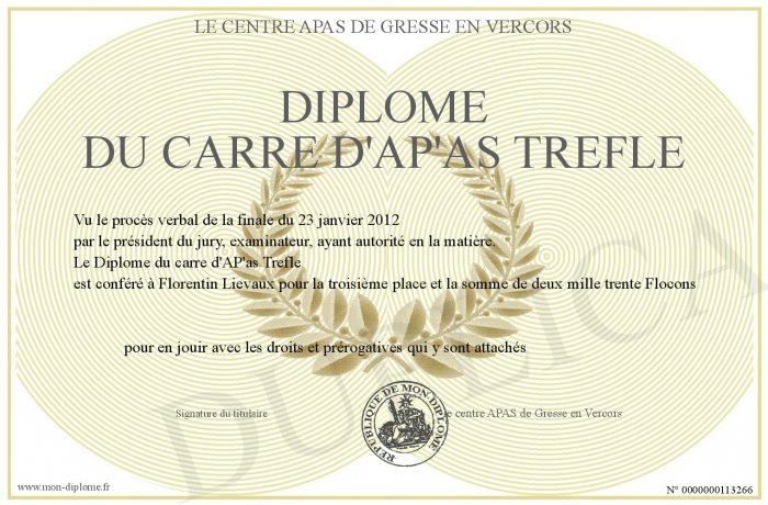 Envoyez par email votre Diplôme du carre d'AP'as Trefle personalisé