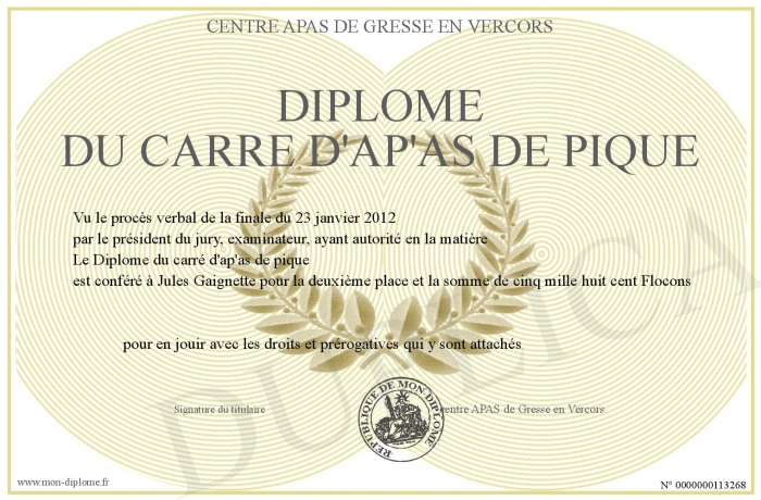 Envoyez par email votre Diplôme du carré d'ap'as de pique personalisé