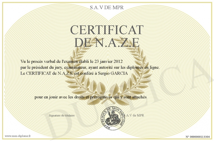 Envoyez par email votre CERTIFICAT de N.A.Z.E personalisé