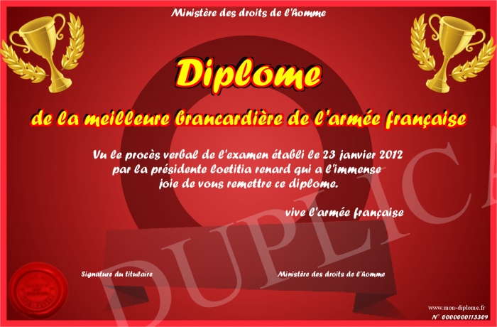 Envoyez par email votre Diplôme de la meilleure brancardière de l'armée française personalisé