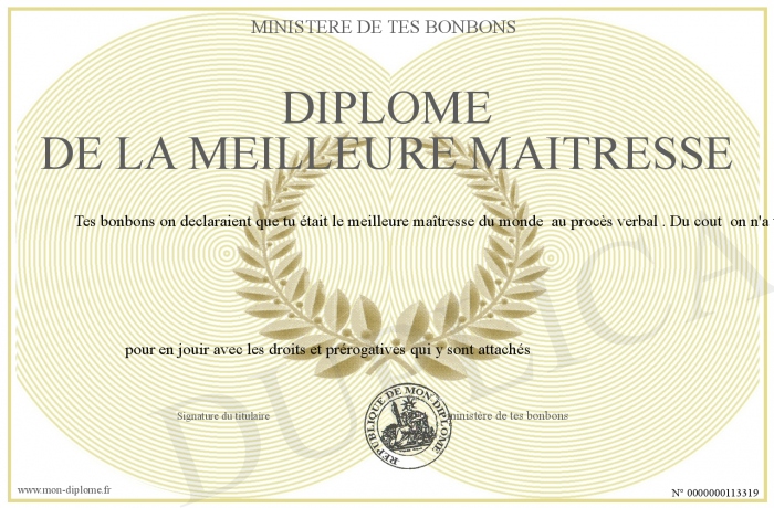 Envoyez par email votre Diplome de la meilleure Maitresse personalisé