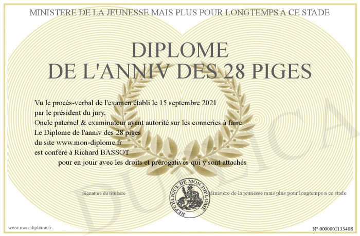 Envoyez par email votre Diplôme de l'anniv des 28 piges personalisé
