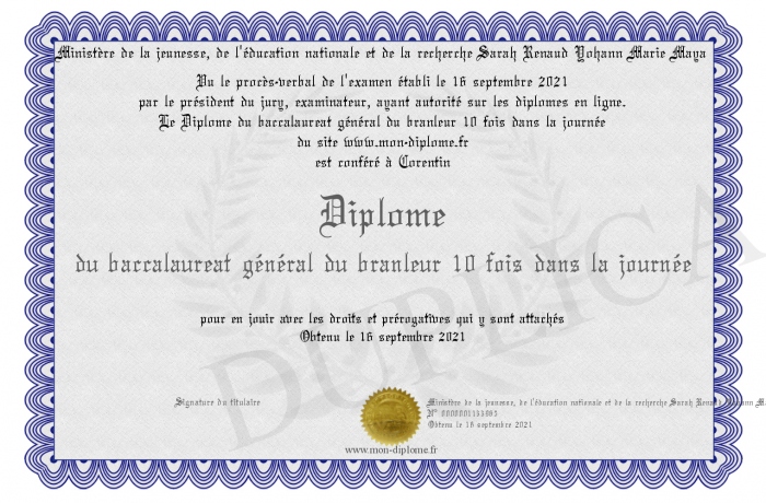 Envoyez par email votre Diplôme du baccalaureat général du branleur 10 fois dans la journée personalisé