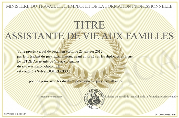 Envoyez par email votre TITRE Assistante de Vie aux Familles personalisé