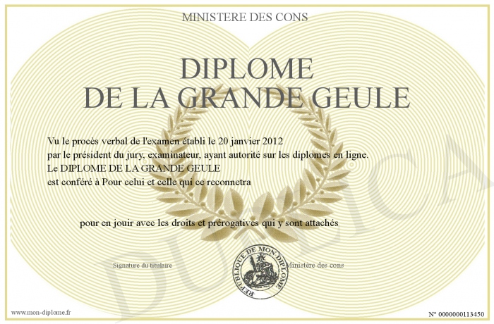 Envoyez par email votre DIPLOME DE LA GRANDE GEULE personalisé