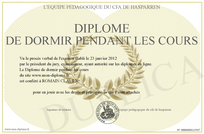 Envoyez par email votre Diplôme de dormir pendant les cours personalisé